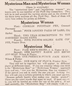 While the parade and slow race were the highlights of Ford Day, merchants hoped to draw people into downtown stores for shopping. To ensure success, they built up excitement ahead of time with the announcement of a Mysterious Man and Mysterious Woman who would be mingling with the shopping crowds. Nobody knew who these two people might be, but all were well prepared for meeting them. “If you think you have the right person you should ask this question in just this way: ‘Are you the Mysterious Ford Man’ or Woman if it happens to be the woman,” instructed the Northern Idaho News. “If you are right a question will be asked you and you are to reply in these words exactly: ‘Because nobody knows what makes you ramble around.'” If this was indeed the Mysterious Man or Woman, the lucky questioner would receive a coupon for one of the prizes which included a fountain pen, a 5-pound pail of lard, or a 2-year subscription to the newspaper.