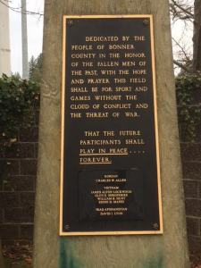 Thus the list of twelve names on the monument at War Memorial Field has grown to thirty-three, magnifying the losses felt by the families and friends left behind in Bonner County in 1918. The names from subsequent wars have mushroomed as well, now spilling over to a second monument which lists those lost in Korea, Vietnam, and Iraq/Afghanistan. The names are prefaced with a dedication to “the people of Bonner County in the honor of the fallen men of the past, with the hope and prayer this field shall be for sport and games without the cloud of conflict and the threat of war, that the future participants shall play in peace forever.”