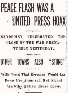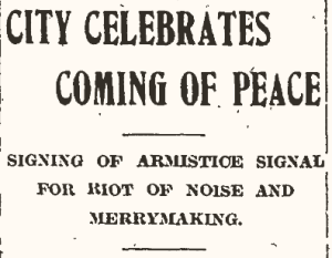 Alas, the celebratory spirit was dampened by evening when news arrived that the armistice had not yet been signed. In fact, the German delegation had not even been given the terms of agreement. Evidently the misinformation had been spread by an unconfirmed story from United Press. Nonetheless, local residents went to bed that night happy to have had an excuse to celebrate.