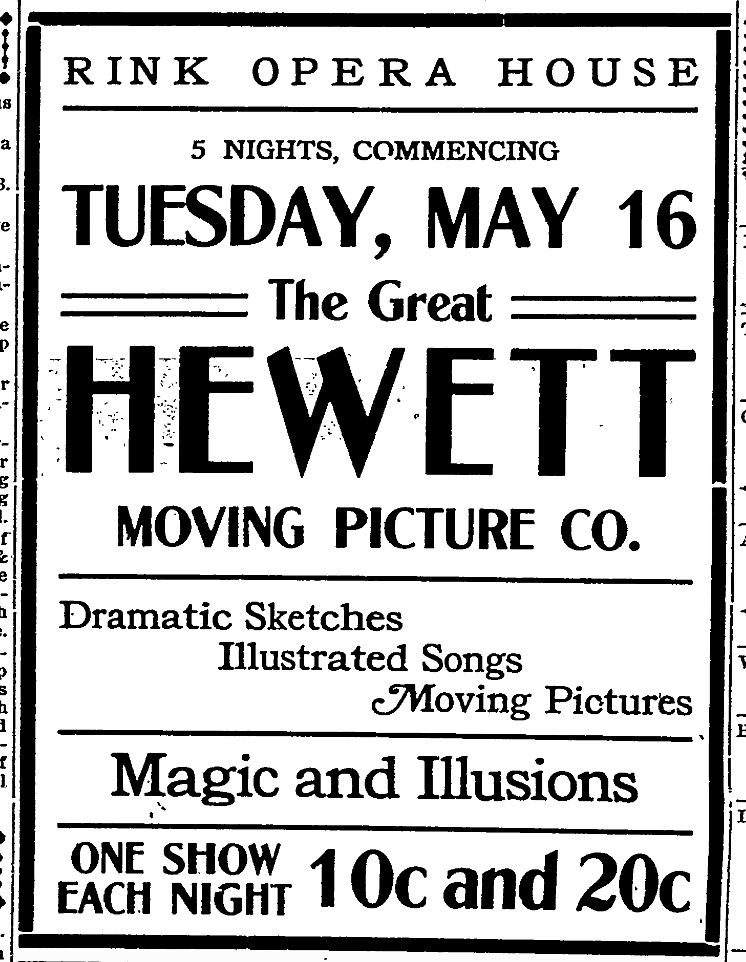 Despite the implication that movies would be a new feature for the business, the Rink had been showing occasional moving pictures since 1908. That year, the management marked the opening of skating season in September with an hour of movies preceding the skating. The Rink offered two nights of cameraphone pictures in April 1910, “pictures that talk, sing and act.” Billed as the first of its kind showing in Sandpoint, patrons were treated to David Warfield in “The Music Master” and “Dr. Jekyll and Mr. Hyde.” A few years later, the Hewitt Moving Picture Company played to large audiences in April 1913 with films on a variety of subjects including the ever-popular Buffalo Bill.